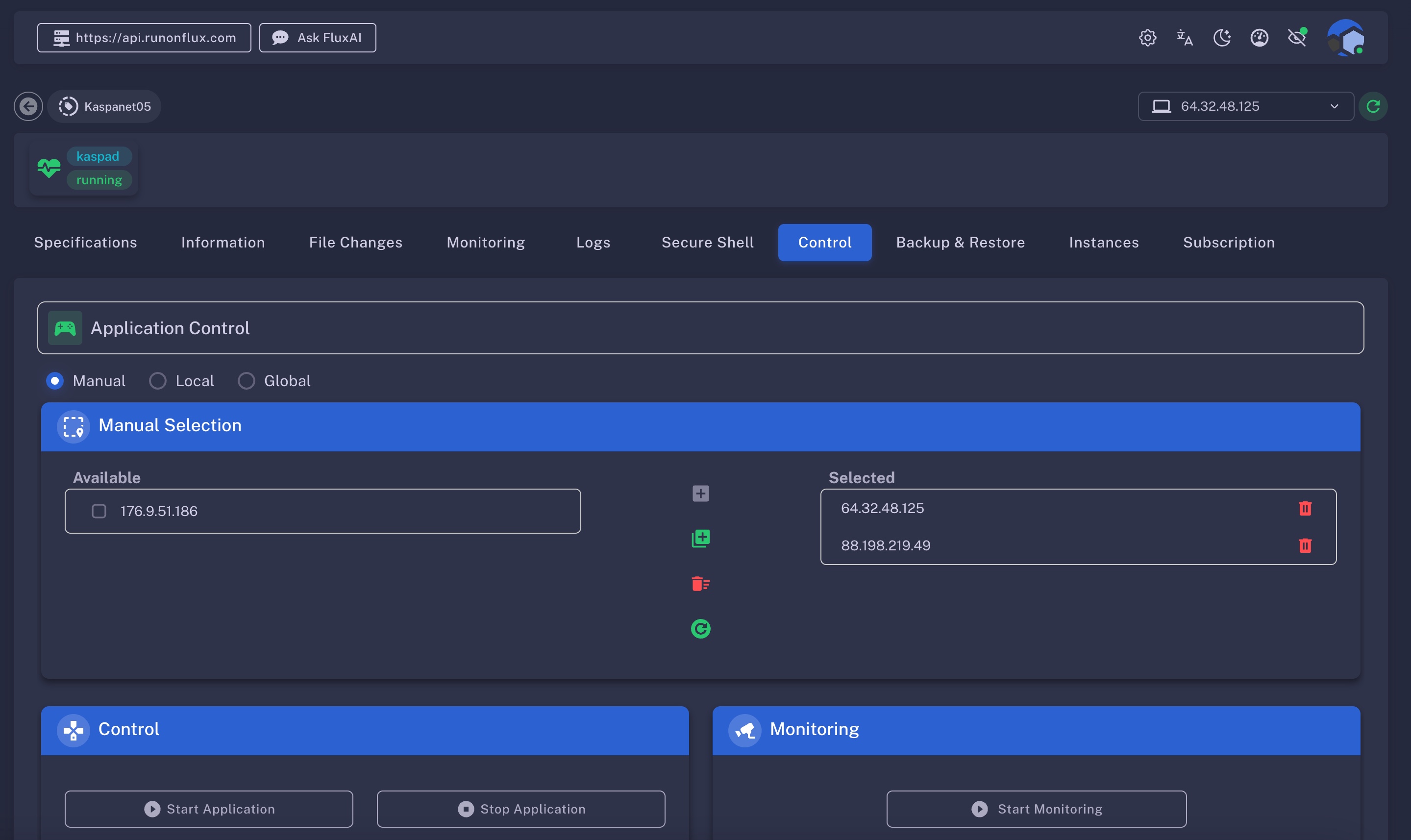 - Manual Control: Manage the application on one, several, or all servers by selecting specific IP addresses to control.
