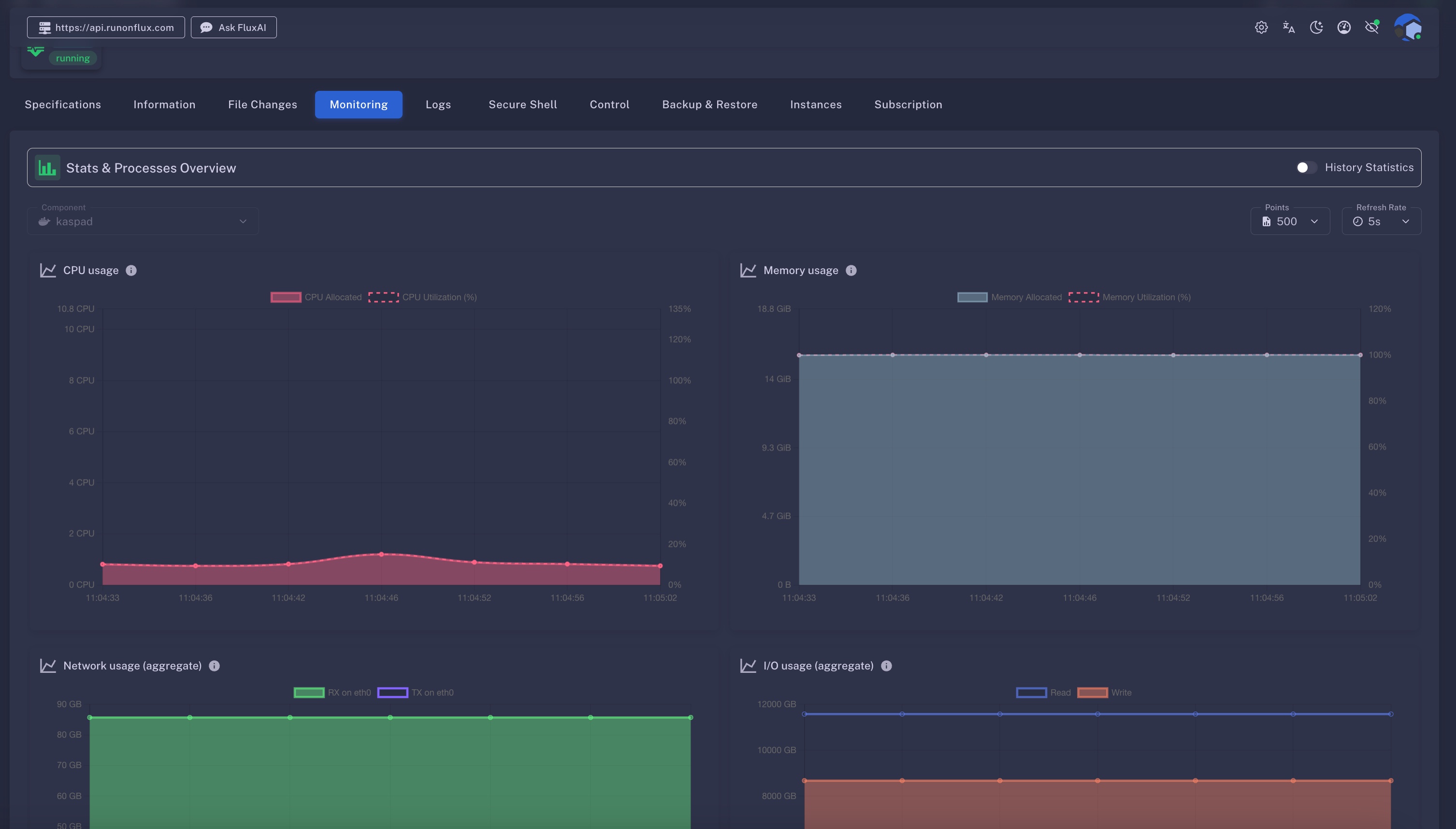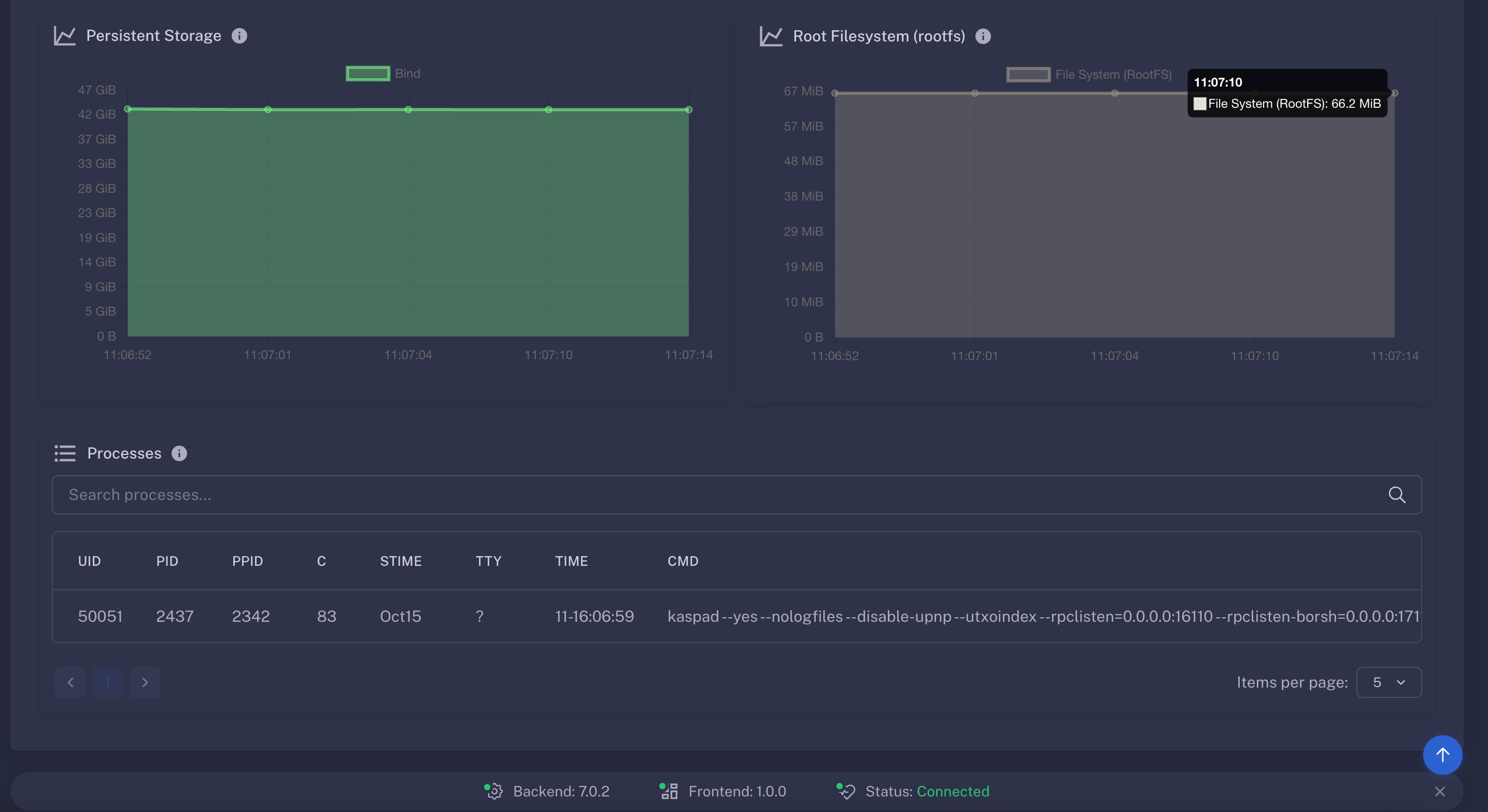 The Monitoring tab provides a live snapshot and historical view of your container’s system usage. It helps you monitor key performance indicators to ensure optimal operation and avoid exceeding resource allocations. This tab also includes a Processes view, offering real-time visibility into active system-level processes running inside the container.