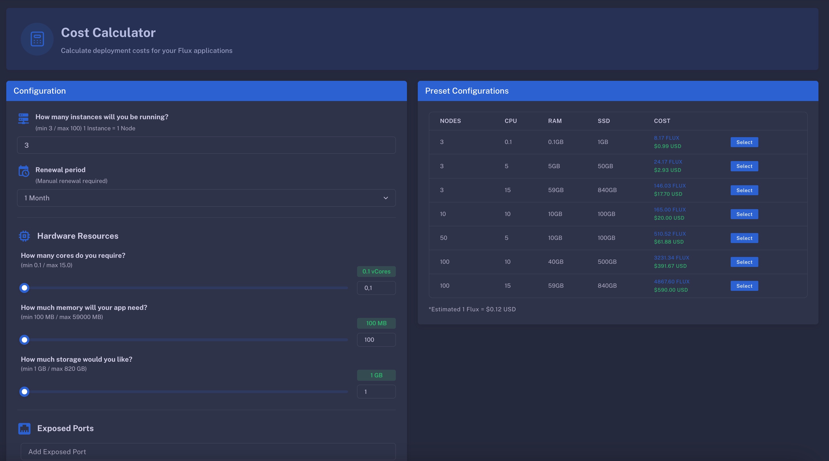 We offer a simple and user-friendly calculator at https://cloud.runonflux.io/cost_calculator to help you estimate how much your application will cost based on your chosen resources and subscription plan.