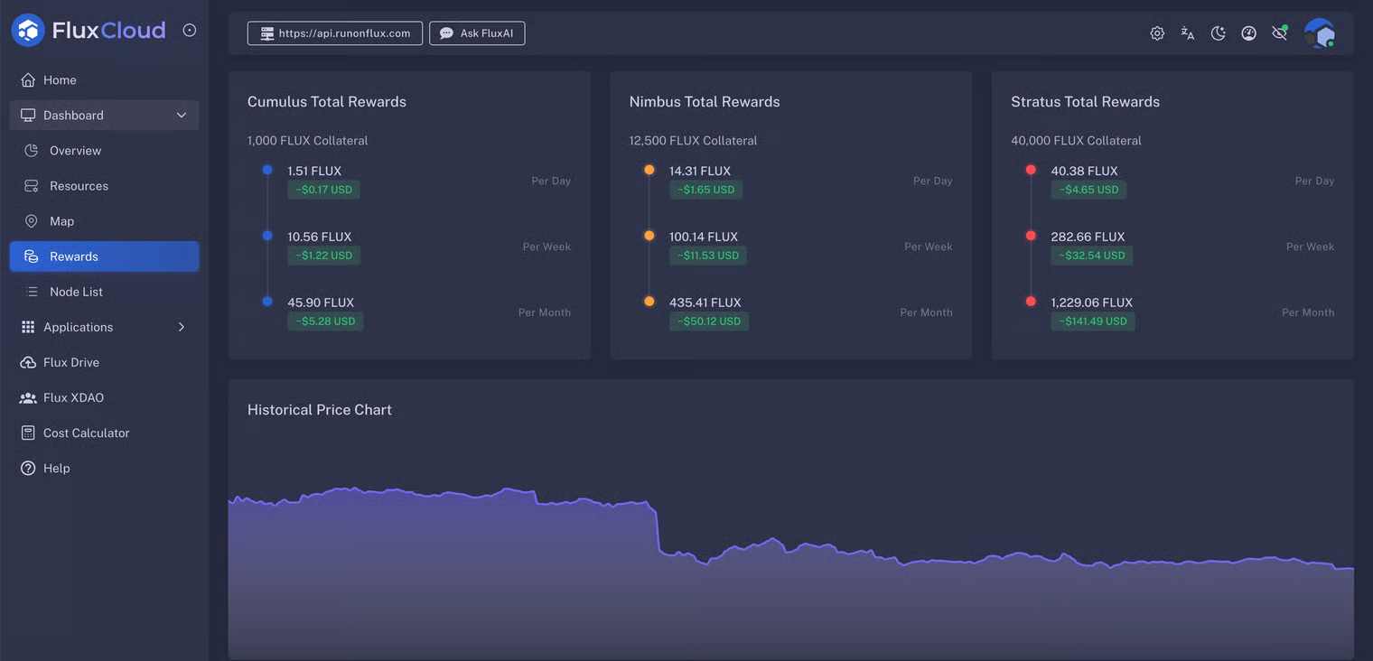 The Rewards tab provides a breakdown of FLUX token earnings for each FluxNode tier across the network.