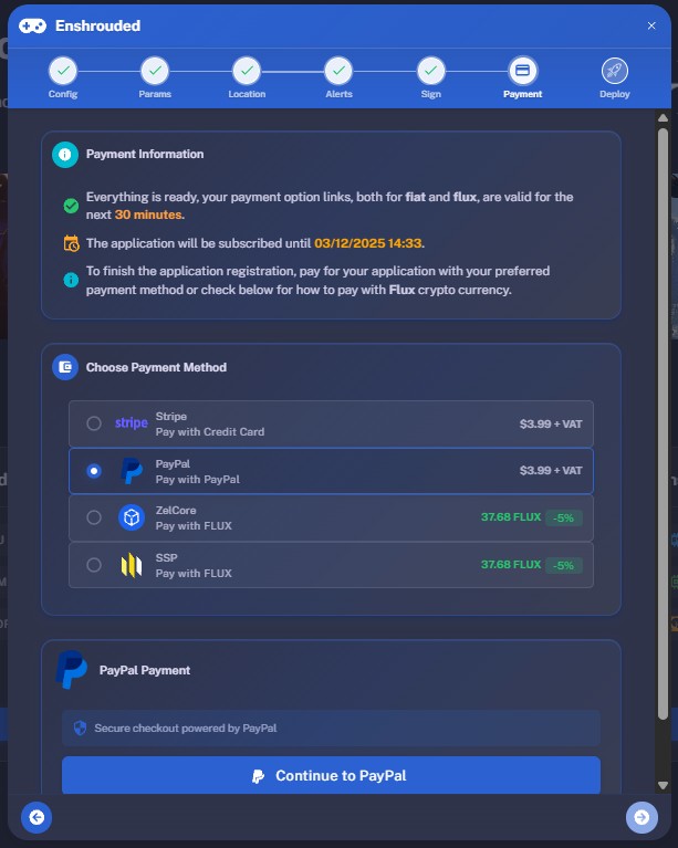- Payment is monitored automatically. Once confirmed, your application will be deployed, and a blue Manage button will appear—directing you to your application’s management panel.