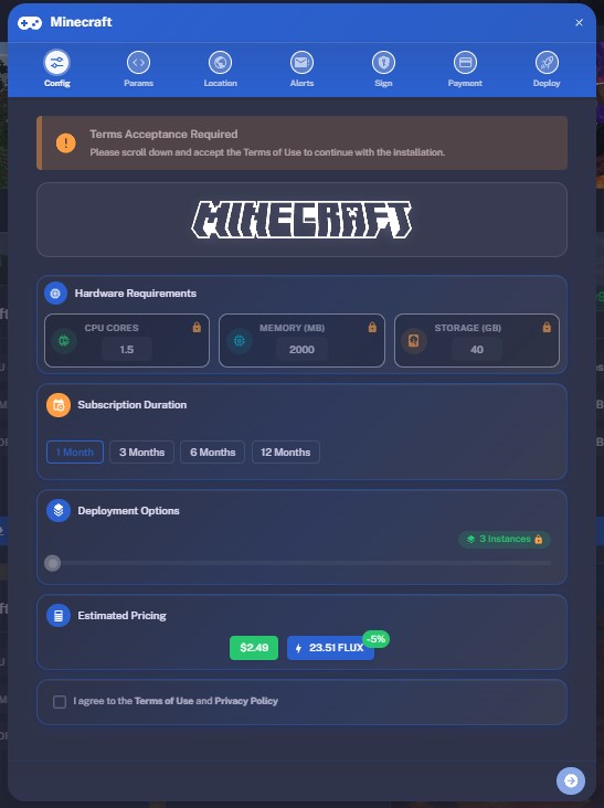This guide walks you through the process of deploying, managing, and connecting to a Minecraft Game Server using FluxCloud. Whether you’re setting up a new server or maintaining an existing one, this page provides step-by-step instructions and key details for a seamless experience.