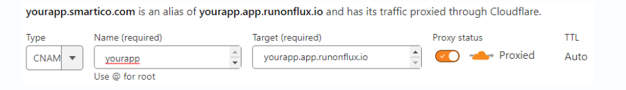 yourdapp.app.runonflux.io(this is your FluxCloud generated domain, you find it by clicking the App Details button on your application under My Apps > Active Apps.) - Proxy Status: Enabled (orange cloud checked)