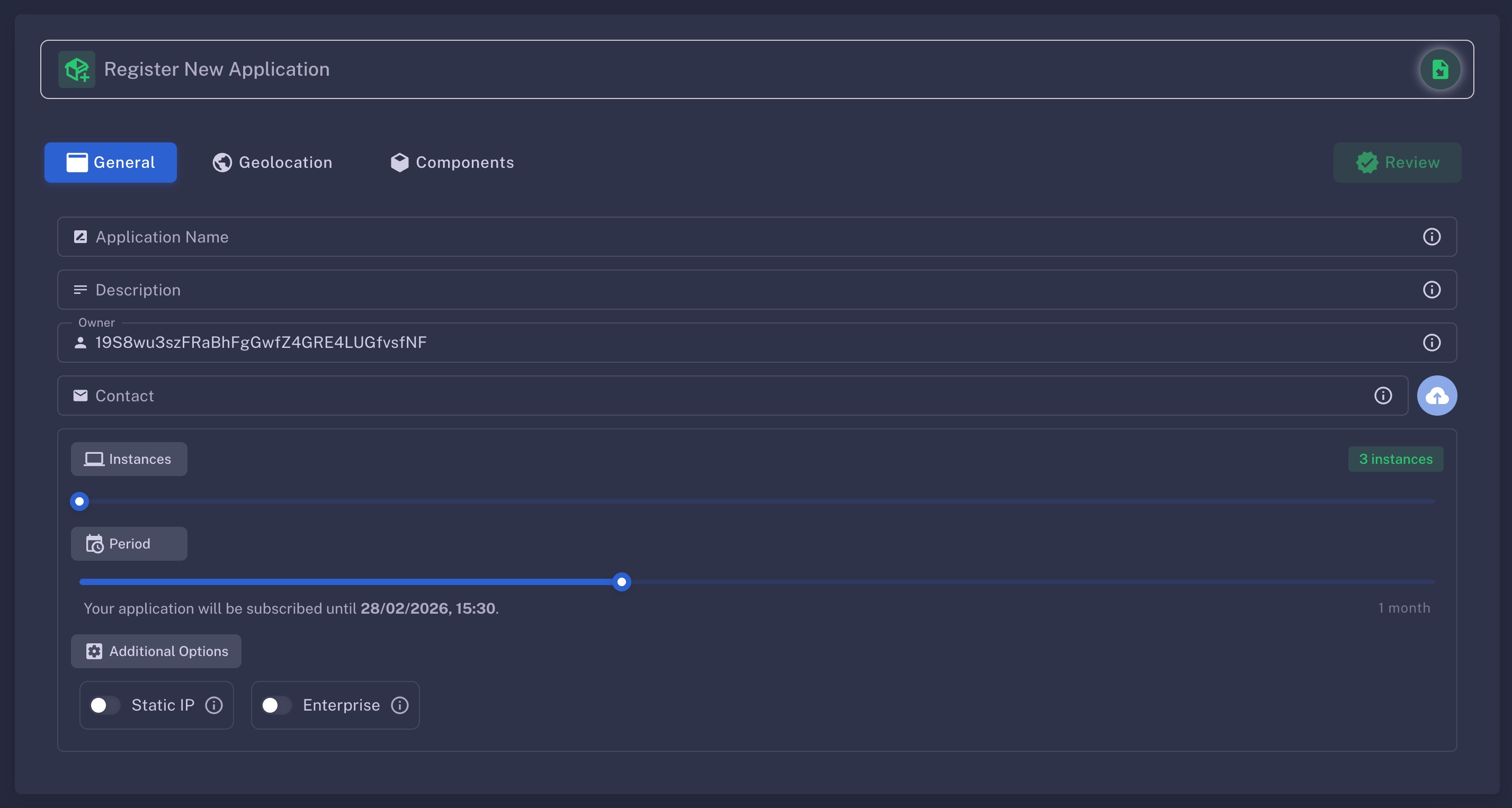 Use this tab to define your app’s name, description, contact information, instance count, and other deployment preferences.