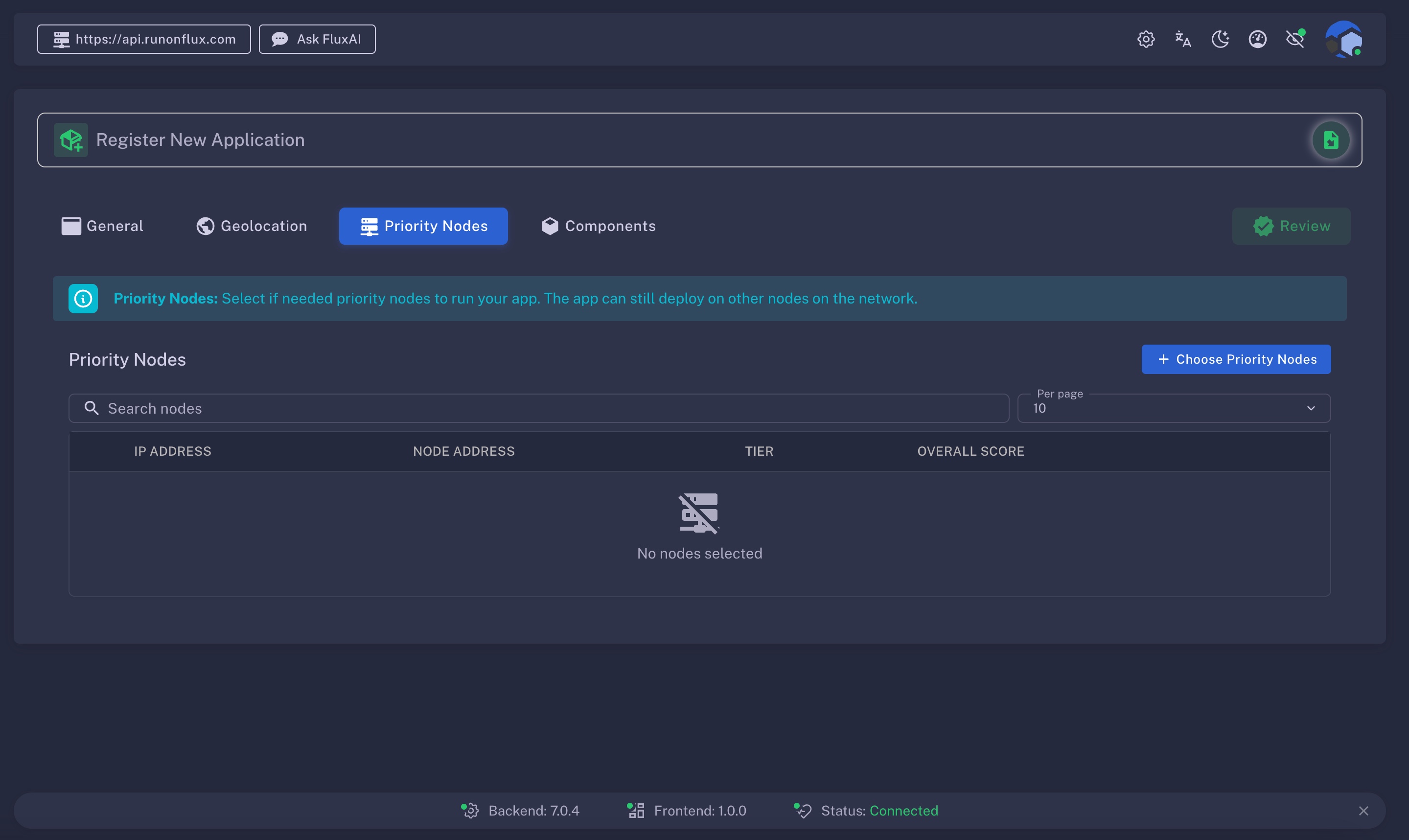 The Priority Nodes tab is only available if you enabled the Enterprise Application option in the General tab. It allows you to define exactly which nodes will host your application—offering advanced security, control, and encryption capabilities.
