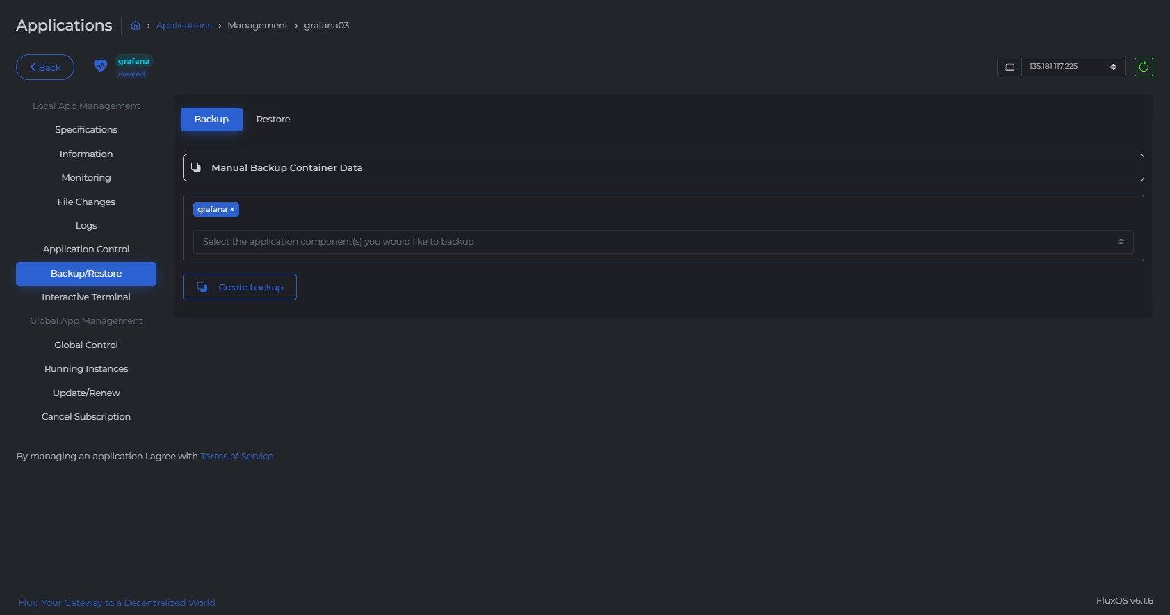 The Backup & Restore tab allows you to create, download, and restore backups of your running application on the Flux Cloud. This ensures you can securely save your application state and recover it in the event of deletion, failure, or redeployment.