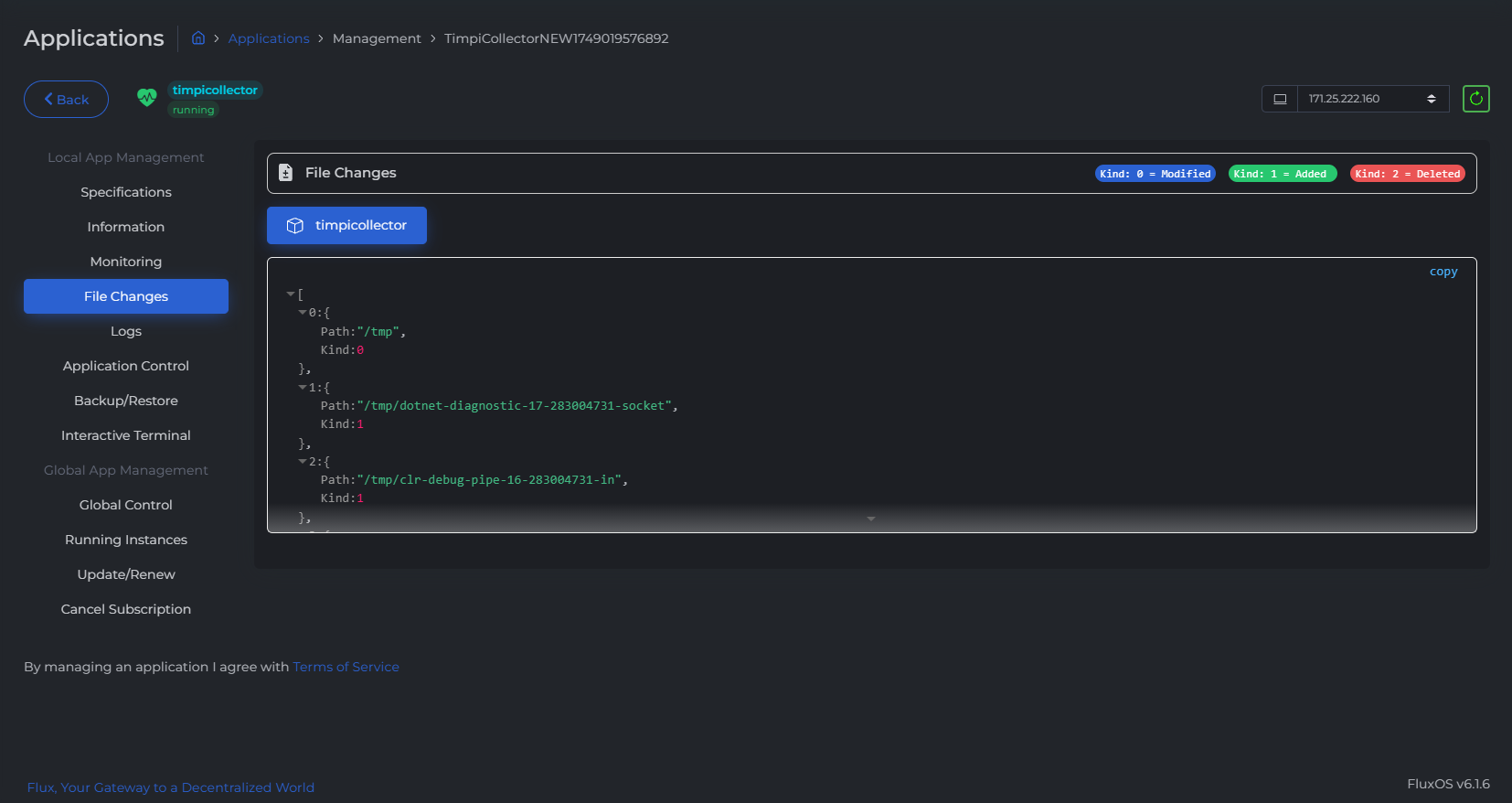 The File Changes tab offers insight into the file system of your application’s container, showing both existing files and those that have been modified since the container was launched. This is especially useful for debugging, verifying application behavior, or detecting unwanted changes.