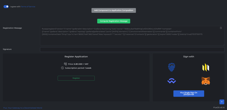 - Click the Register button to propagate the signed message across the Flux network.