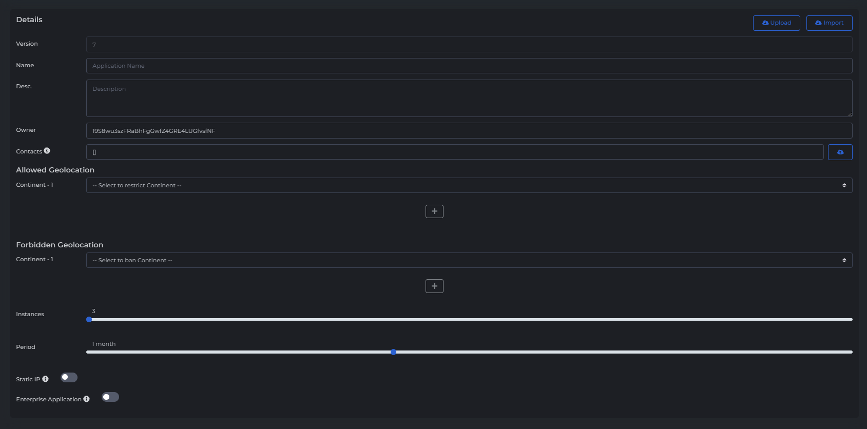 Use this section to define your app’s name, description, contact information, deployment locations, instance count, and other preferences.