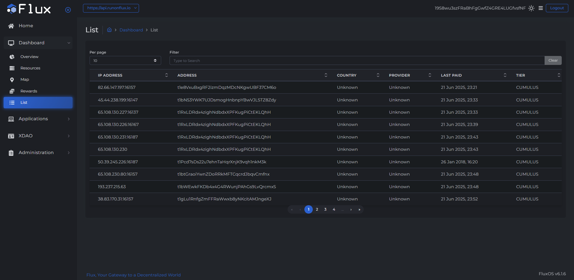 - Pagination: Easily navigate between pages to browse the full list of FluxNodes.