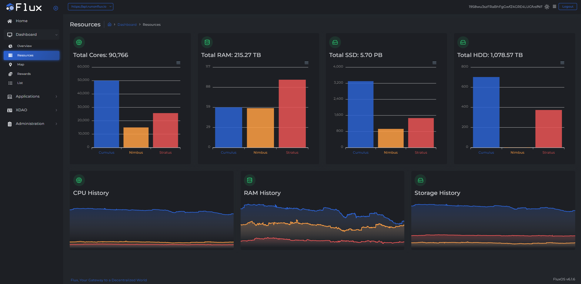 The Resources tab details the hardware capacity available across the FluxCloud network.