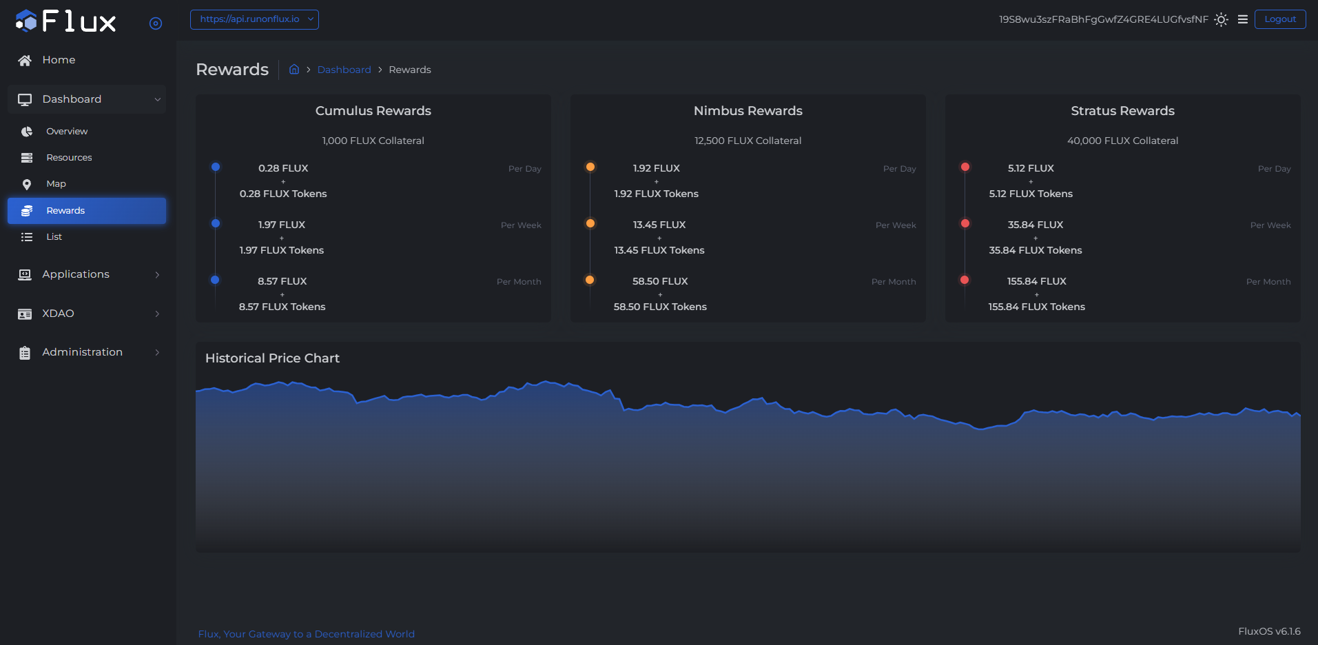 The Rewards tab provides a breakdown of FLUX token earnings for each FluxNode tier across the network.