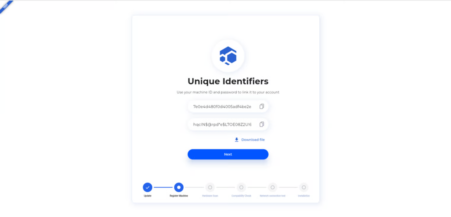During Step Two (Register Machine), you will be prompted to download a file containing your Machine ID and Password.