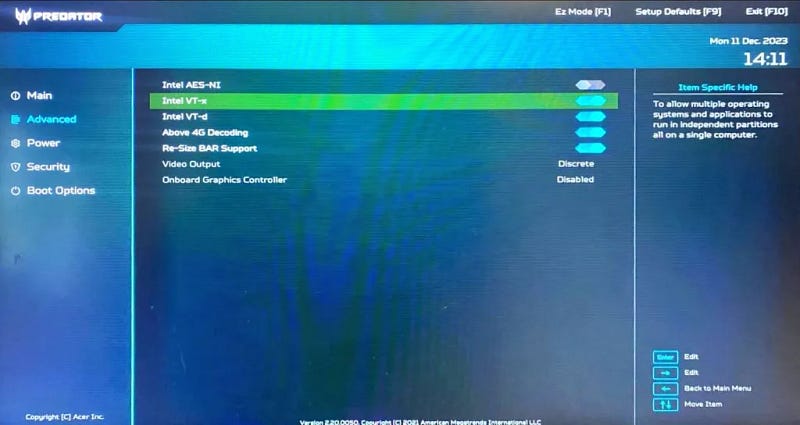- Ensure that both Intel VT-x and Intel VT-d are enabled.\