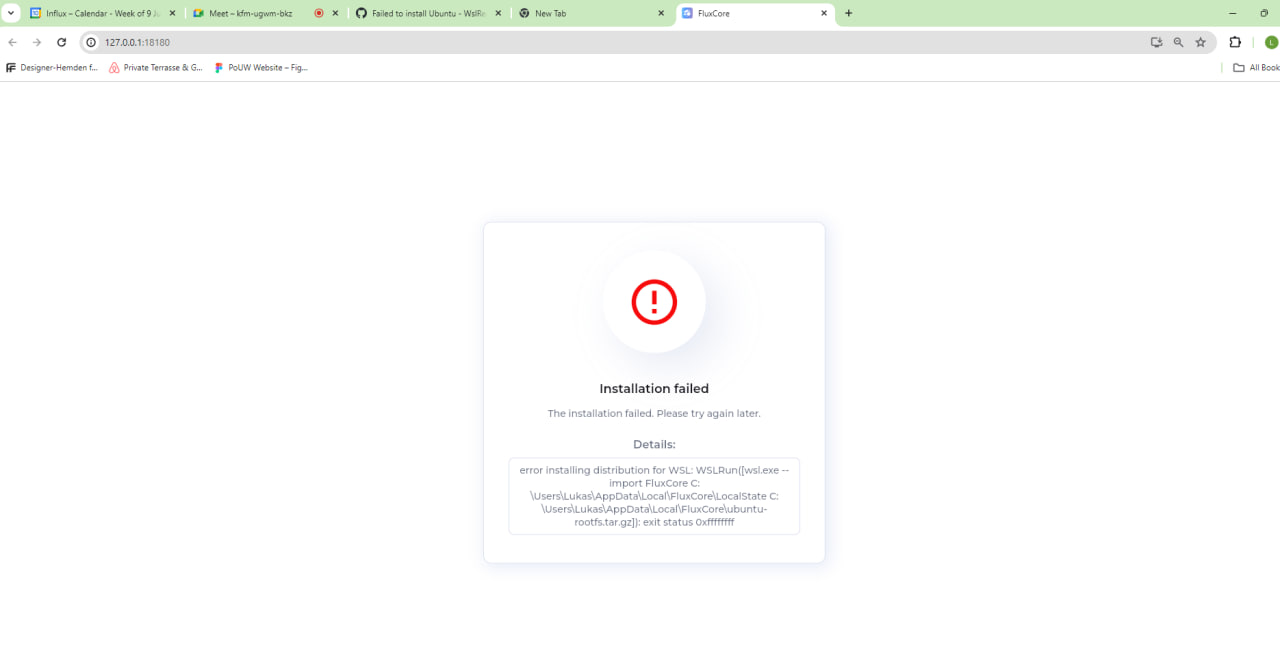 - If you encounter this message during the FluxCore installation or while the UI is installing dependencies, it indicates an issue with your WSL (Windows Subsystem for Linux) setup.