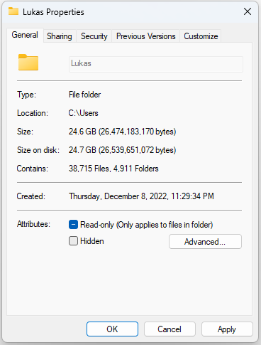 C:\Users\<User>folder, select "Properties," check the "Hidden" checkbox, click "Apply," and then "OK." - Navigate to