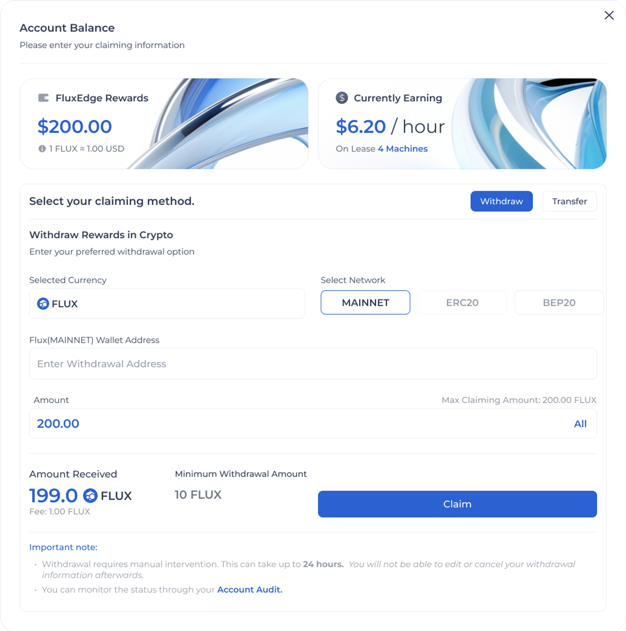 - All claims are in FLUX and can be withdrawn to Mainnet, Ethereum, or Binance Smart Chain. Enter your wallet address, the amount, and click Claim. Fees and minimum withdrawal amounts vary by network. Note that withdrawals require manual intervention and can take up to 24 hours. Monitor the status through your Account Audit.