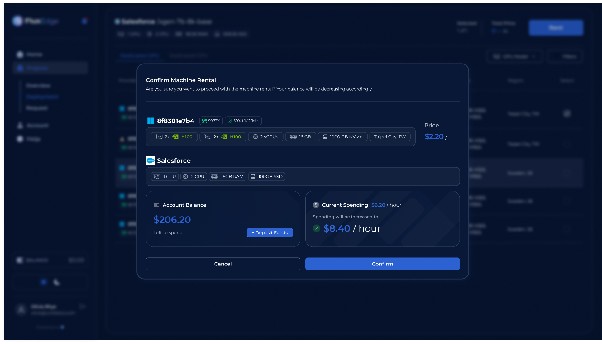 Select your desired machine via the radio button. At the top of the screen, you will see a summary of your selection with the hourly price. Click the "Rent" button to open a confirmation popup showing a summary of the rental and its financial impact. Confirm to complete the rental and proceed to the Deployments Information screen.