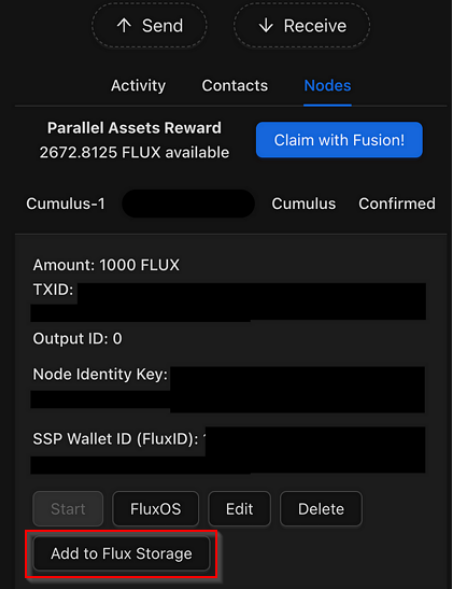 - Open SSP Wallet → Nodes tab → Add to Flux Storage.