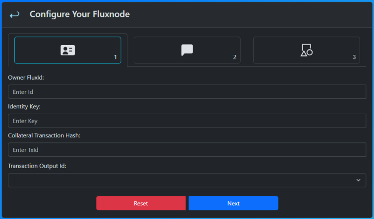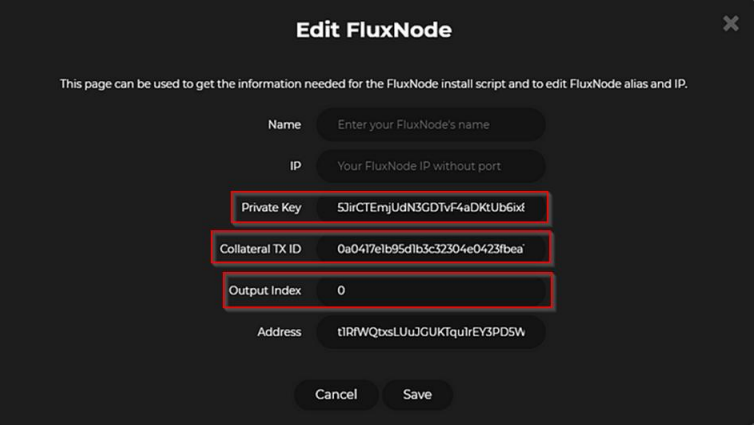 - In the FluxNode web UI, fill in the four fields you gathered.