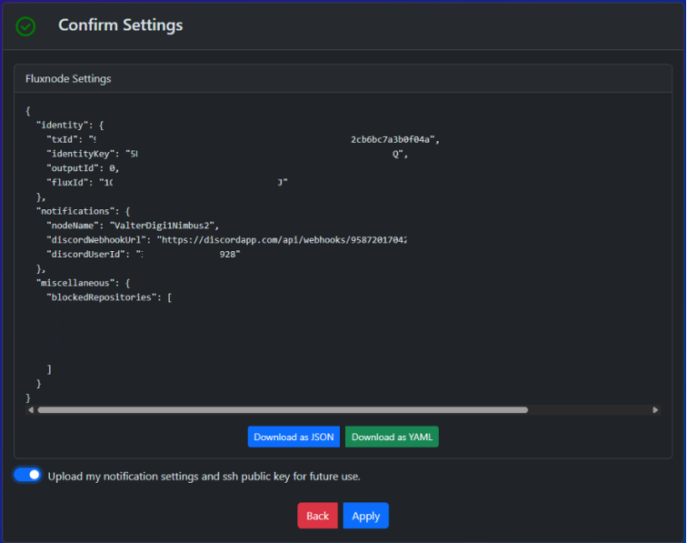 - Upload your current config (notifications, SSH, blocked ports/repos) for reuse on future node installs
