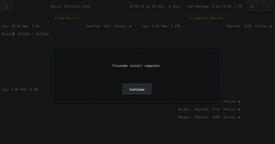 - FluxOS remains “offline” in the dashboard until fluxd is fully synced.