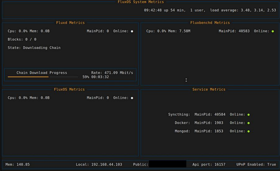 - FluxOS remains “offline” in the dashboard until fluxd is fully synced.