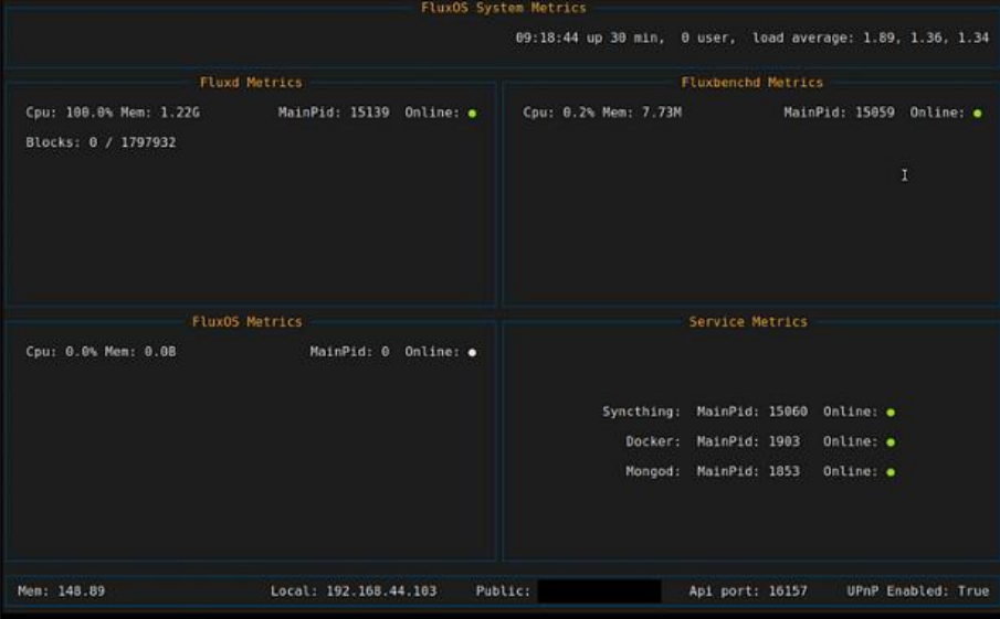 | Service Health | Status indicators for core services (fluxd, fluxbenchd, syncthing) |