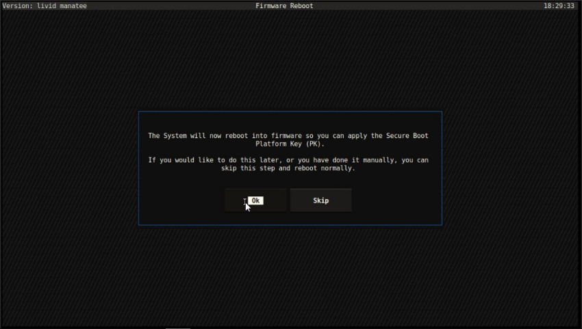 | Install & Reboot | Watch the progress bar, then reboot and enroll the Secure Boot Platform Key (PK) if needed. |