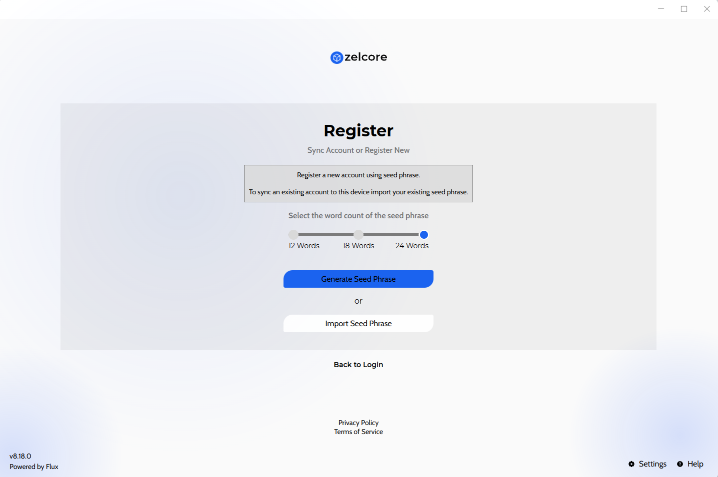 - Launch the app and click “Sync/Register BIP44 Seed Phrase Account.”