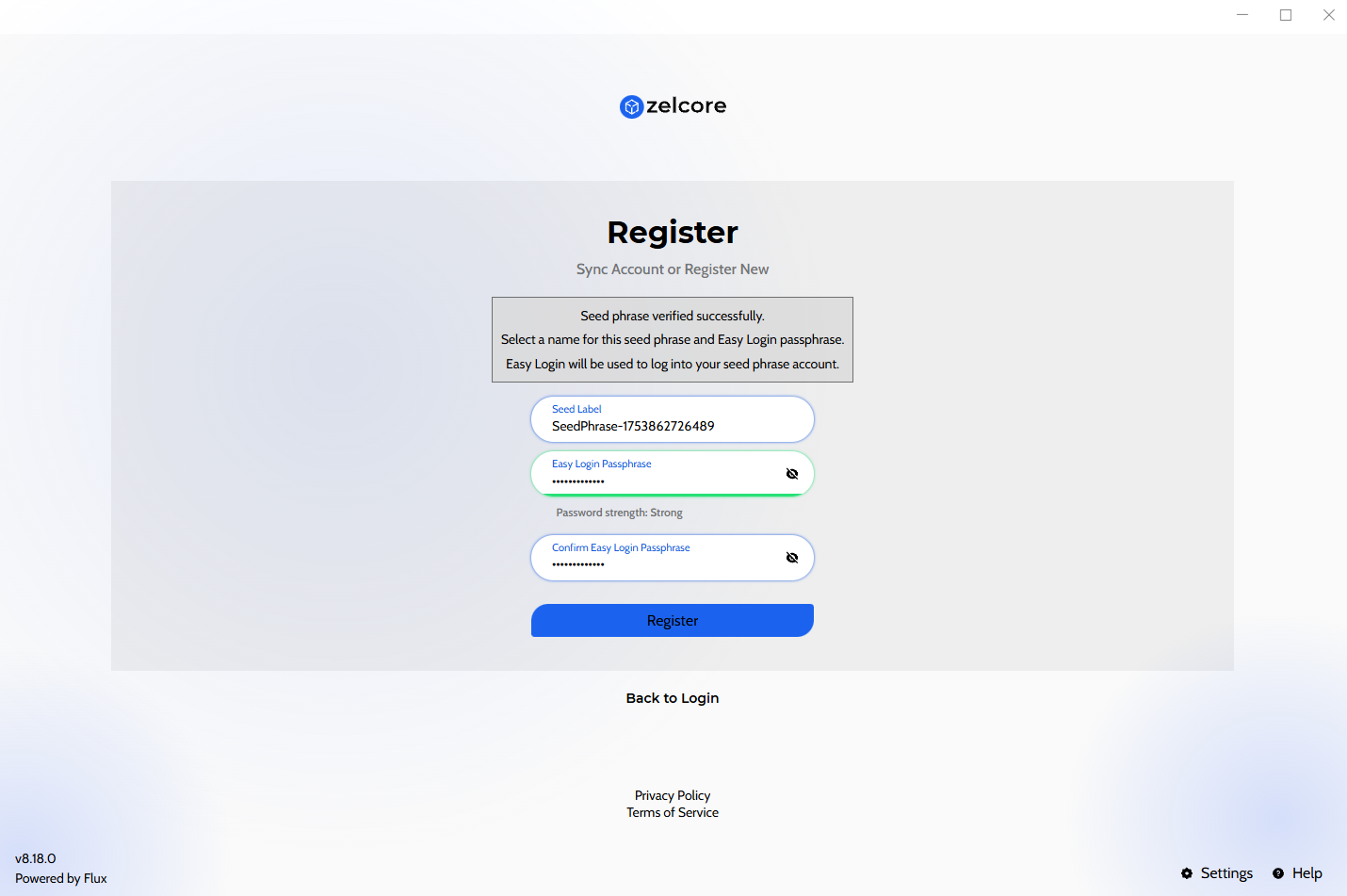 - Once verified, enter a name for your seed phrase and set an Easy Login password.