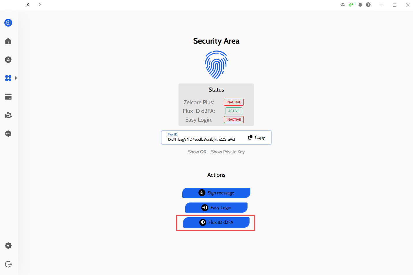 For increased security, enable d2FA—an encrypted PIN stored on the Flux blockchain: