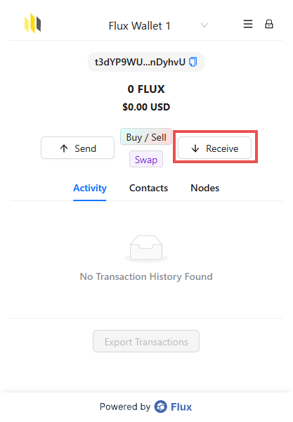 - Select Flux from your Assets, then click Receive to view your Flux receiving address.