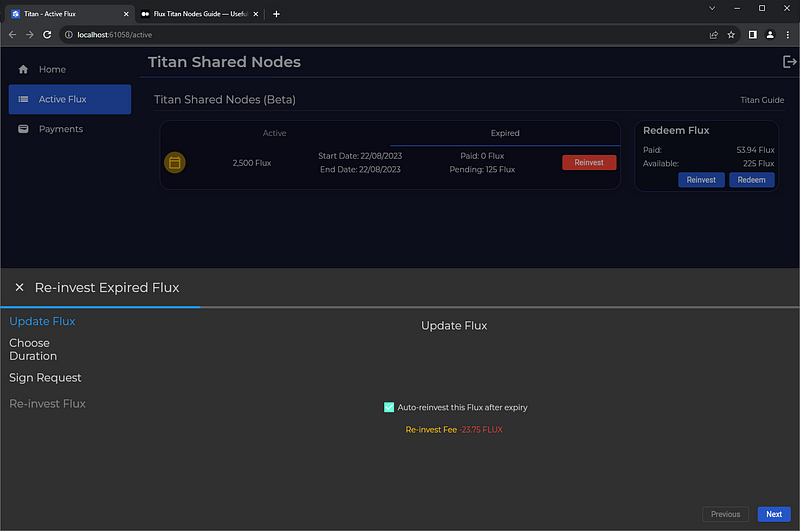 - From the "Active Flux" section, click the "Reinvest" button next to your rewards.