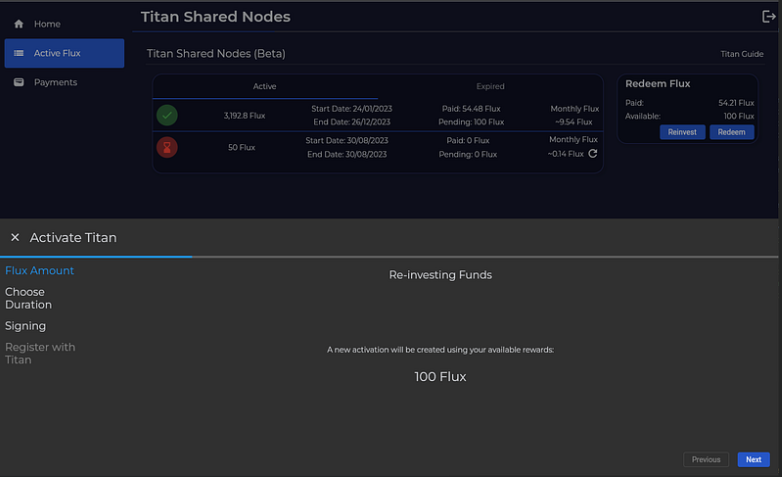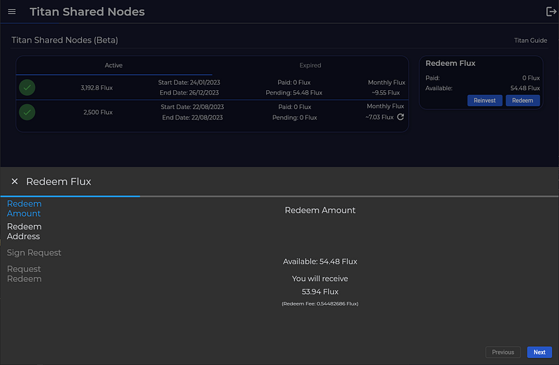 Titan Nodes allow you to redeem rewards before your lock-up period ends, as long as you have at least 50 FLUX available for redemption. Rewards are distributed twice per week, every Monday and Thursday morning at around 9:00 AM UTC.