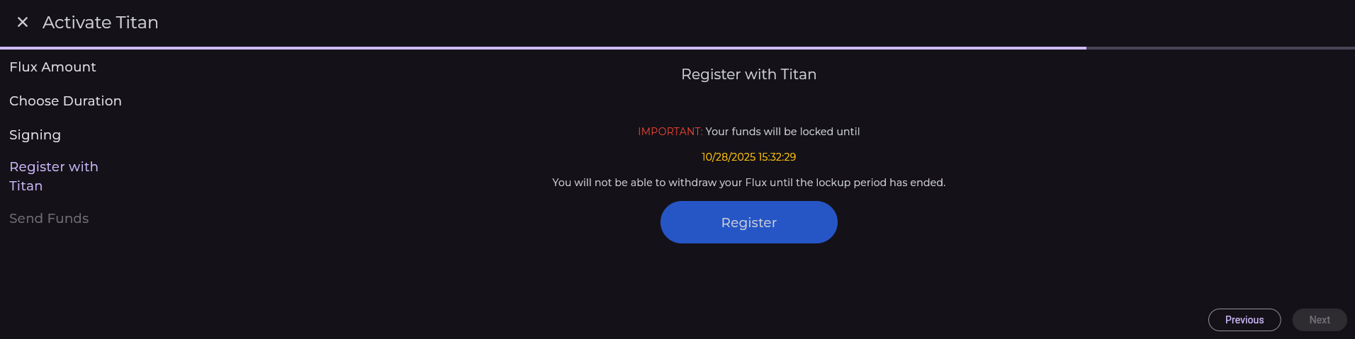 - You’ll go through the same Titan Node setup process as when you first registered, except for the initial amount entry step (your reward amount is automatically filled).